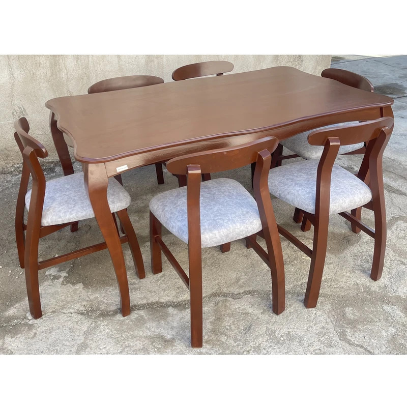 میز فوق از جنس چوب راش گرجستان با صفحه mdf میباشد رنگ قسمت های چوبی میز و صندلی ها در تمام سفارشات ارسالی ثابت میباشد که مطابق عکس ارسال میشود و تنوع انتخابی شما مربوط به رنگ پارچه نشیمنگاه میباشد.
