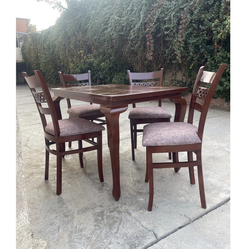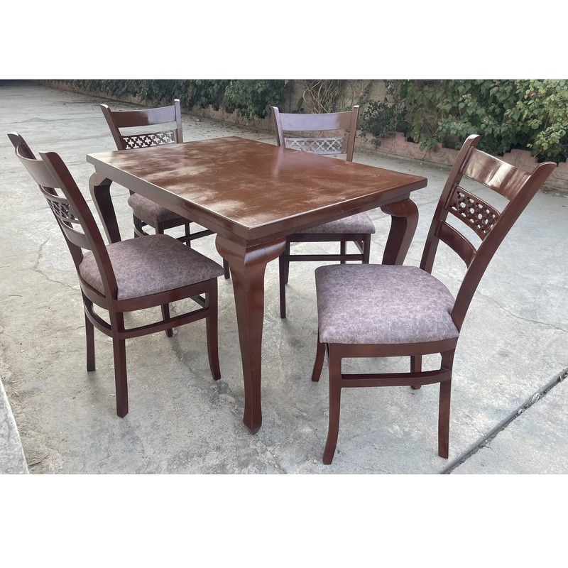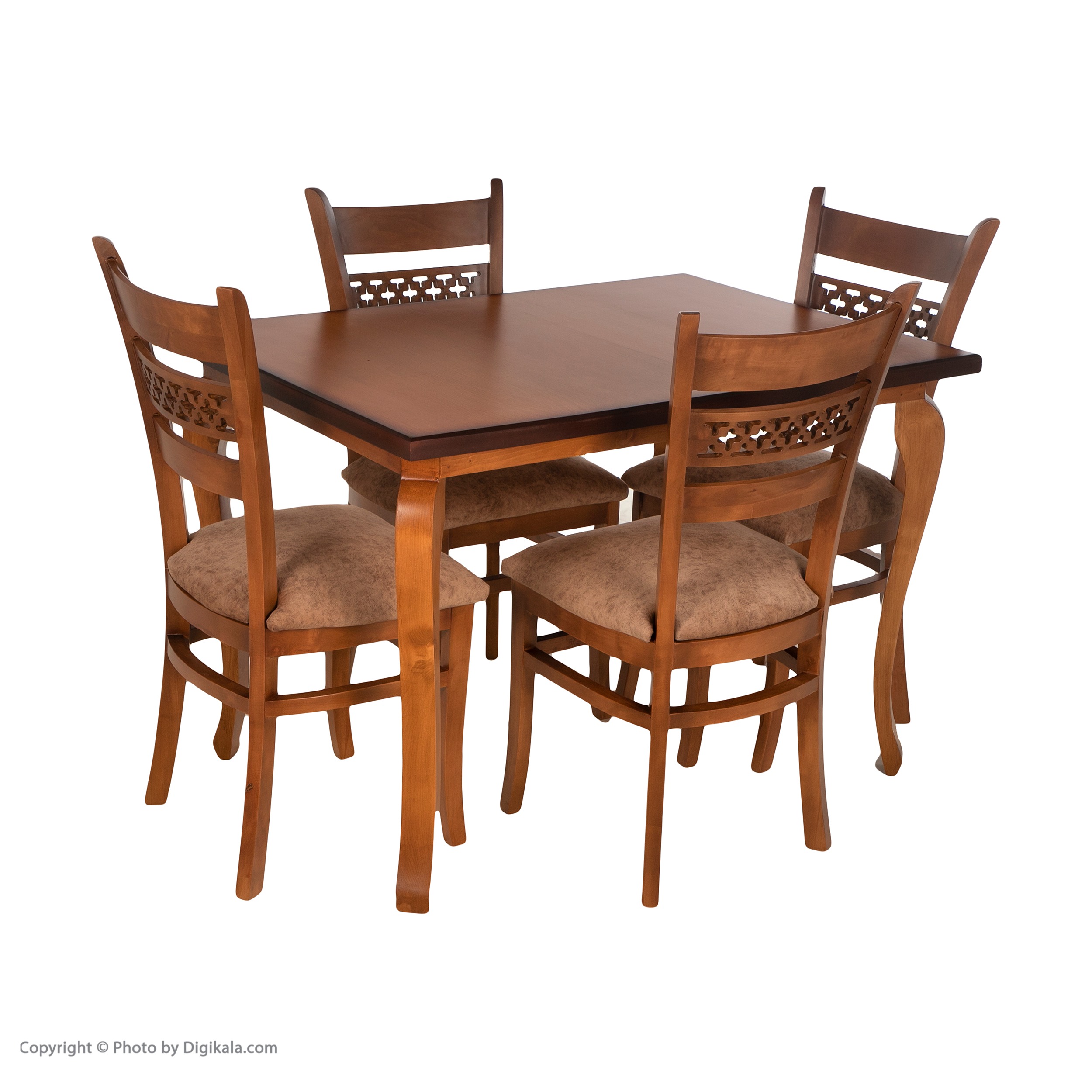 میز فوق از جنس چوب راش گرجستان با صفحه mdf میباشد رنگ قسمت های چوبی میز و صندلی ها در تمام سفارشات ارسالی ثابت میباشد که مطابق عکس ارسال میشود و تنوع انتخابی شما مربوط به رنگ پارچه نشیمنگاه میباشد.