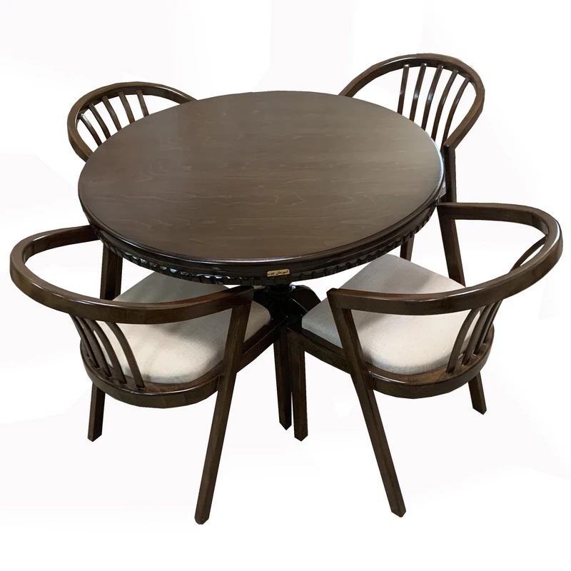 میز فوق از جنس چوب راش گرجستان با صفحه mdf میباشد رنگ قسمت های چوبی میز و صندلی ها در تمام سفارشات ارسالی ثابت میباشد که مطابق عکس ارسال میشود و تنوع انتخابی شما مربوط به رنگ پارچه نشیمنگاه میباشد.