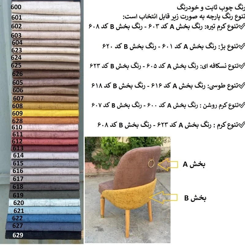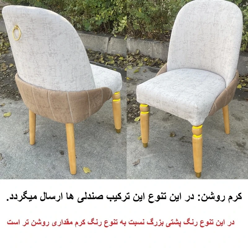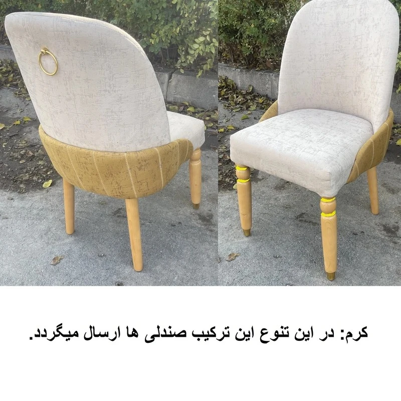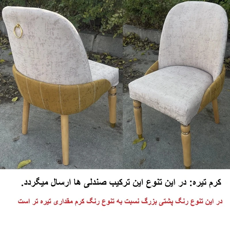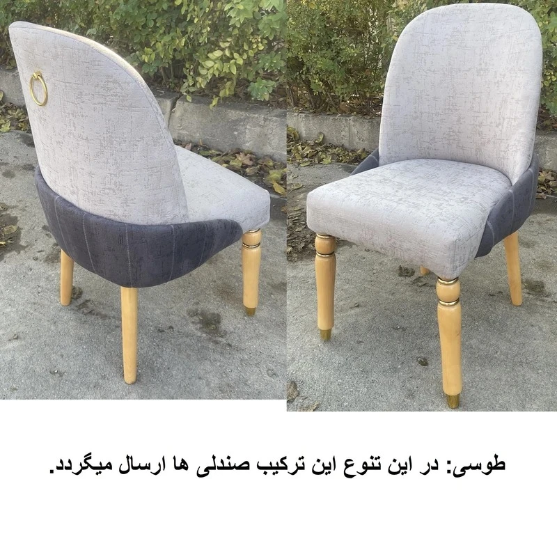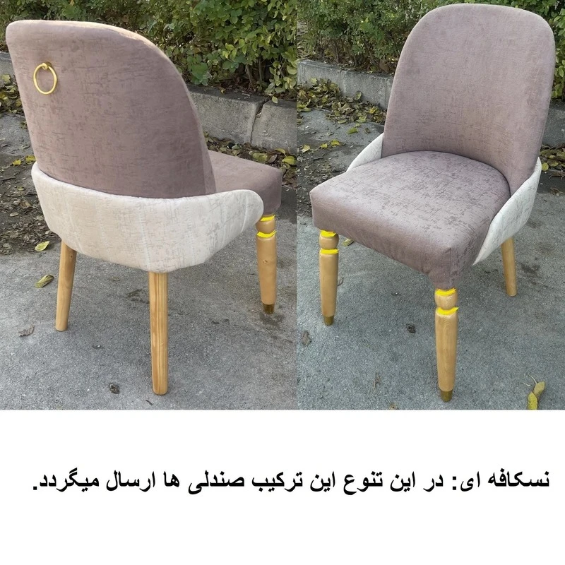 این محصول با داشتن صندلی های بادوام و بسیار راحت همواره جزء پرفروشترین ها تولیدی ما محسوب میشود . پارچه استفاده شده در این صندلی ها با درجه کیفی بسیار بالا است. در کفی این صندلی ها از فوم خارجی مرغوب استفاده گردیده که در زمان استفاده طولانی مدت مراقب سلامتی شما عزیزان باشد . کلاف بندی این صندلی ها ، بسیار اصولی بوده و با استفاده از دستگاه های روز دنیا تولید میگردد . توجه داشته باشید رنگ بخشهای چوبی این ست ثابت مطابق تصویر بوده و رنگ پارچه بر اساس تنوع قابل انتخاب است درصورتی که تنوع انتخابی شما چند رنگ بود. رنگ بکار برده شده در پارچه این ست مطابق با تصویر میباشد.